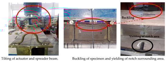 In this study, the ultimate load was determined as the load at which the compression flange buckled, causing the actuator to suddenly tilt and forcing the authors to stop the test immediately for safety reasons. This is the load that caused the beginning of permanent deformation in the test specimens.