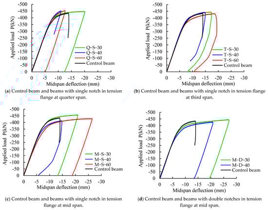 All the notch-damaged steel specimens had their notches in the tension flange located at a quarter (Q) and third (T) of the clear span from the right support and at the midspan (M). The applied load–midspan deflection relations for all tested beams are depicted in Figure 5. Initially, all the beams had the same stiffness and the deflection increased linearly at the same rate until the specimens started to yield. After yielding, the specimen stiffness decreased, causing the deflection to increase at a faster rate. It is clear from Figure 5 that all tested specimens had almost the same load-carrying capacity and that their behavior had a similar pattern. However, Figure 5a shows that the absence of symmetry and closeness of the notch to the support appeared to be the more significant factors affecting the stability of the beam than the size of the notch. As indicated above, the tests stopped when the actuator twisted and the specimens were unloaded. It is worth noting that this study considered only two specimens with double notches, M-D-30 and M-D-40.