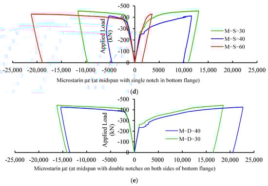 Figure 6 presents the applied load–strain relations in all tested steel specimens. Figure 6a shows the response of the extreme top (compression) and bottom (tension) strains at the midspan of the control beam. The strains in Figure 6b–e are the top and bottom strains at cross-sections passing through the notch. Figure 3 shows the strain gauges at a section passing through the notch. For the control beam, it is apparent from Figure 6a that the top and bottom strain responses were almost identical, which is expected as the strain gauges were located at the section of maximum moment of the undamaged beam. It can also be noticed that at a load of 420 kN, the top strain response showed a clear yielding point beyond which the strain demonstrated a yielding plateau behavior with a minor increase in the applied load; whereas the bottom strain response showed a change in the rate of the increasing strain at a load magnitude of 280 kN, and as the load was increased, the bottom strain increased at a faster rate until the strain reached the yield plateau zone at a load of 420 kN. All of Figure 6b–e show that the top and bottom strain responses presented similar pattern as that of the control beam but with different strain values. Figure 6b,c show that for notches located at one-quarter and one-third of the specimen span, including the different notch sizes considered in this study, the beam top and bottom strain values at the notch section did not significantly vary. It can be concluded that if the notch, with the sizes examined in this study, is located anywhere within one-third of the beam clear span, the beam behavior was not sensitive to the notch location. However, when the notch is at the midspan of the beam (Figure 6d,e), the top and bottom strains increased significantly, indicating that the beams exhibited ductile behavior and were able to undergo larger deflections. As a result, when the notch is at the midspan of the beam, the beam becomes more resilient. This change in behavior can be attributed to the location of the notch. When the notches were at one-quarter and one-third of the clear span, the steel beams were not symmetrical, causing the vertical deflected shape to be unsymmetrical as well. As the load was increased, the unsymmetrical cross-section of the beams at the notch location made the beam to buckle unsymmetrically out of plane. The simultaneous effects of unsymmetrical vertical deflection and out of plane buckling expedited the torsion of the beams at small strain responses, whereas for beams with notches at their centerlines, the beams were symmetrical, causing a symmetrical vertical deflected shape and the symmetrical out of plane buckling of the beam. As a result of this dual symmetry in deflection and out of plane buckling, the beams showed more resilient responses as the load was increased and, eventually, experienced larger top and bottom strains.