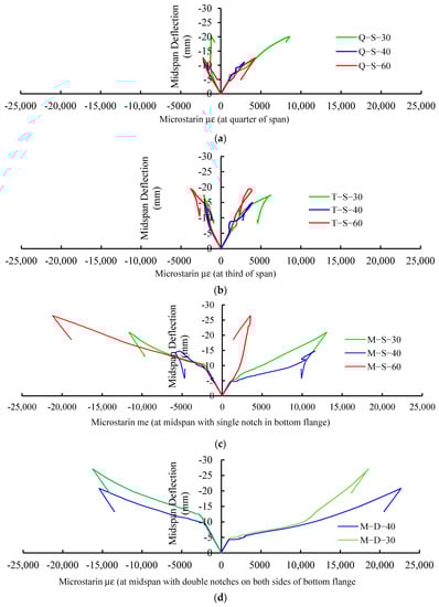 Figure 7 shows the midspan deflection–strain responses in all tested steel specimens. Figure 7a,b show that the top and bottom strains at the location of the notch were very small and somewhat the same as the deflection increased. However, when the notch was at the midspan of the beam, the top and bottom strains increased significantly as deflection increased, as shown in Figure 7c,d. The latter figures also indicate that as the deflection reached 5 mm, the bottom flange started to yield while the top flange remained elastic. As the deflection increased, the bottom strain increased much faster than the top strain. When the deflection was almost twice as much (about 10 mm), the top flange started to yield while the bottom flange had experienced large inelastic deformation. This is attributed to the beam’s neutral axis being shifted up towards the top flange due to the notch being in the bottom flange. It can be established from Figure 7c,d that when the deflection reached almost 10 mm, the top strain response was linear and it was not sensitive to the location of the notch. On the other hand, the bottom strain response was significantly affected by the location of the notch. Therefore, the location of the notch did not have a major impact on the deflection of the beam but it did accelerate the yielding and plastic behavior of the tension part of the beam way before it did for the compression part of the beam.