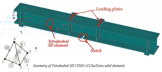 ATENA-3D software has three different types of 3D solid elements: tetrahedral elements 3D (CCIsoTetra), brick elements (CCIsoBrick), and wedge elements (CCIsoWedge). In this study, the three element types were examined to tune the FE mesh, and it was found that the tetrahedral 3D (T3D) (CCIsoTetra) solid element was the most appropriate element that best explained the behavior of the specimens and, therefore, was used in this study to generate the FE models. Hence, the maximum T3D element size of 25 mm and up to 16500 T3D elements used in the steel specimen modeling were found to be adequate to produce acceptable results within a balanced analysis running time. Figure 8 shows a FE mesh of the W-shaped steel beam with a notch in the bottom tension flange at the middle of the span.