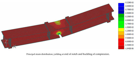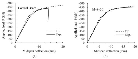 Figure 10 shows similar failure modes in tests and FE models (buckling in the compression flange). It is apparent from the figure that the predicted numerical failure mode was in agreement with the test failure mode. This similarity between the numerical and test failure modes confirms the accuracy of the numerical simulation generated in this study.