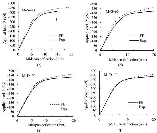 Figure 9a–f show a comparison between the experimental and numerical FE load–deflection responses of each individual specimen with notches at the midspan. It is clear that the proposed FE model predicted load–deflection responses are identical and comparable to their experimental counterparts. Figure 9b,f show that the numerically predicted stiffness and peak load were almost the same as those of experimental work for specimens with single and double notches, M-S-30 and M-D-40, whereas for the rest of the specimens, the numerically predicted stiffness and peak load were on the average between 2–4% higher than the experimentally obtained ones. This slight discrepancy could be attributed to misalignment of the specimen or the deflection measuring device during testing. These identical results between the experimental and numerical FE load–deflection responses ensure that the proposed FE model can be utilized for further investigation of the behavior of damaged steel beams with notch sizes and locations other than the ones considered in the experimental program of this study.