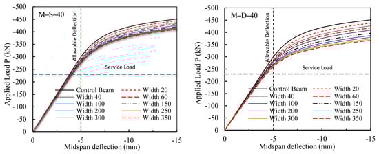 Figure 11 indicates that when the depth of the notch increased, the load-carrying capacity of the beams was significantly affected. This can be explained by the observation that when the notch depth increased, the notch damage got closer to the beam web and, therefore, the stress concentration at the end of the notch became within the vicinity of the beam web, leading to an increase in the web strains and stresses. The increase in the web strain and stress led to a decrease in the beam stiffness and capacity and to an increase in the defection rate. This analysis is clearly confirmed by Figure 12 and Figure 13, where for M-S and M-D beams with notch depths of 80 mm, the stresses and strains were concentrated and high not only in the beam flange but also in the beam web, due to the nearby notch. On the other hand, as the width of the notch increased, these high stresses and strains spread, affecting a larger area of the web, as revealed in Figure 12 and Figure 13, and caused a wider portion of the beam to yield. As a result, the stiffness of the beam decreased, the beam capacity decreased, and the beam deflection rate increased rapidly, which accelerated the occurrence of permanent deformations. The figures show that the damage affected the stiffness of the beams, resulting in an increase in deflections at design loads. This impact of the damage on the steel beam deflection should be addressed in design codes for serviceability requirements.