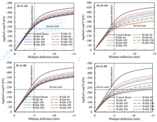 To relate the above findings to practical everyday applications, the service load was assumed to be equal to half the maximum applied load, i.e., 455 kN/2 = 228 kN. For steel beams, deflection due to service live load is of concern in the finished structures and, therefore, the allowable deflection (i.e., deflection limit) considered in the discussion of the numerical result findings was set to be equal to δ = L/360 = 1800 mm/360 = 5 mm, where L is the beam span length. Hence, horizontal and vertical lines showing the level of the service load and the allowable deflection, respectively, were drawn in Figure 10. With these two lines established, it is clear from the figure that although all damaged beams, with the exception of M-D-80 beams, performed well in service load conditions with deflections less than the allowable deflection, the load capacity of the beams at the allowable deflection was considerably influenced by the notch depth and width. As a result, all damaged beams would not require any immediate action in service load conditions except those of M-D-80, where immediate and urgent action would be needed, such as replacing or retrofitting the beams. However, the decision for any needed repair in terms of urgency depends on the load capacity of the damaged steel beams at the allowable deflection.