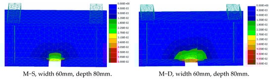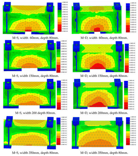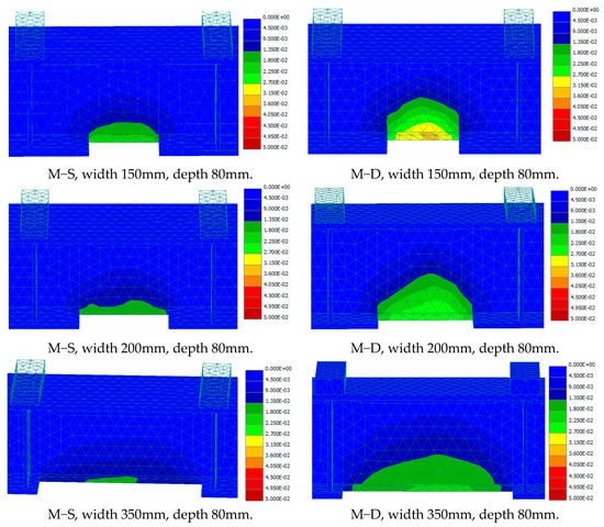 Based on the verification of the FE model in the previous Section (Figure 9 and Figure 10), the numerical investigation was extended to cover further different notch depth and width values, with the notch damage being considered in the tension side and only at the beam midspan since this was the worst damage location scenario, as revealed by the results shown in Figure 5, Figure 6 and Figure 7. The extended analysis examined beams with single notches (M-S) and double notches (M-D) at midspan with 40 mm, 60 mm, and 80 mm in depth, and 20 mm, 40 mm, 60 mm, 100 mm, 150 mm, 200 mm, 250 mm, 300 mm, and 350 mm in width.