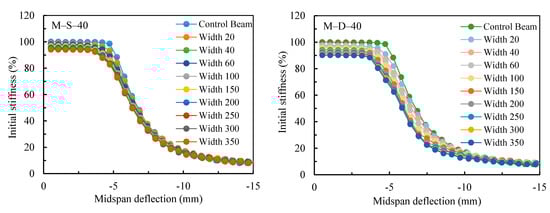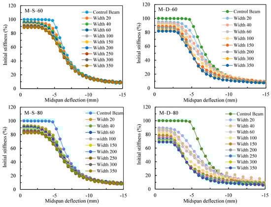 The numerical relative stiffness of the damaged steel beams versus the numerical midspan deflections are drawn in Figure 15. The figure demonstrates that the yielding of the M-S beams was reached faster as the depth of the notch increased while increasing the width of the notch did not sizably affect the beginning of the plastic behavior. On the other hand, M-D beams demonstrated that a quicker yielding of the beam was achieved at small deflection values as the depth of the notch increased. In addition, as the width of the notch increased, the softening of the beam (plastic behavior) was reached at much smaller deflections than those in the M-S beams. This is due to the spreading of the yielding stress over a larger web area, as confirmed by the stress and strains distributions in Figure 12 and Figure 13. Figure 15 reveals an interesting observation and that is the curves of the damaged beams are shifted to the left as if the beams were already loaded and deformed. As a result, the beams reached the allowable deformation and plastic behavior at lower loads. The results highlight the applicability of using the finite element technique to investigate the maximum acceptable damage size with respect to the reuse of any damaged beam based on its configuration.