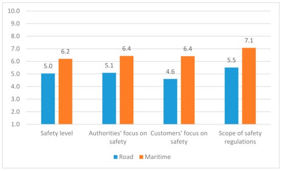 Results for four questions based on the formulation: “Imagine a scale from 1 to 10 indicating the level of safety, where 10 corresponds to the level of safety in international commercial aviation”, “How would you rate your sector?” Similar questions were asked for: authorities’ focus on safety, customer focus on safety and scope of safety regulations. Respondents from road (N = 66) and Maritime (N = 46).