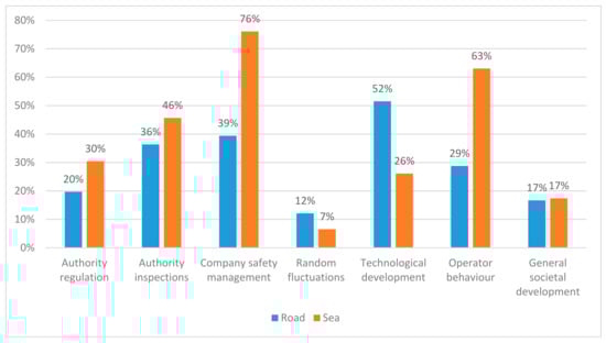 Figure 3 indicates that the most important answer provided by respondents from the road sector is technological development; half of the respondents from road answered this, which is twice as much as in the maritime sector. The most prevalent answer provided by respondents from the maritime sector is companies’ safety management. This is in accordance with Hypothesis 3, and we can probably attribute this result to the focus on SMS in the maritime sector. The share answering “company safety management” in the maritime sector (76%) is nearly twice as high as that in the road sector (39%). This result is not surprising, given the fact that SMS is not mandatory in the road sector.