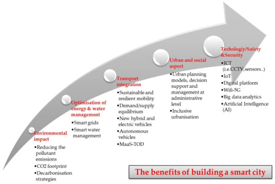 The exemplification of the modal choice of transport is implemented through the dissemination of digital platforms such as Mobility as a Service (MaaS) [23] and Transport on Demand (TOD) [24] that allow the user to visualise the possible routes and the different modes of transport available and also to select the best modal choice considering sustainable and cost-effective solutions. These platforms allow several partners to exchange and share data to make decisions on mobility services, considering the recent spread of e-mobility [25]. The Figure 1 below, therefore, summarises the benefits of technology deployment and smart cities.