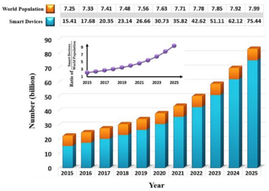 Quantity of projected smart devices connected to the Internet with the estimated world population [26].