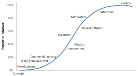 Many of the technologies applied in CAVs are currently under development and will have to go through several steps to become reliable, affordable, and, therefore, commercially available in most markets. Hence, like all new technologies, even those related to CAVs, it can be assumed that it should generally follow an S-shaped development curve, according to Rogers’ law [42], as shown in Figure 3 below.