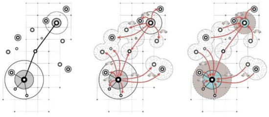 It is possible to highlight three main categories of CAVs’ influence on the urban form: urbanisation, road infrastructure, and impact at the local level [48]. The first group includes the factors that influence the structure of the city. As depicted in Figure 4, the introduction of autonomous vehicles can lead to urban sprawl and lower building density. Nevertheless, on the other hand, it can increase the accessibility of some previously inaccessible areas (red arrows in Figure 4).