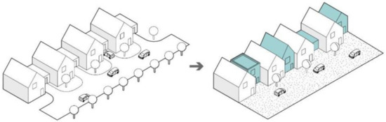 Concerning local changes, CAVs can impact residential development in the city centre and the suburbs. With the coming of autonomous vehicles, it will be possible to free many areas currently used by cars, which will have to be adapted and reused for other functions (Figure 8). For instance, the conversion of parking areas with the construction of new buildings for offices, homes, shops, or recreational spaces will lead to a consequent increase in the density of buildings. Some spaces currently occupied by private garages will be freed up (Figure 9).