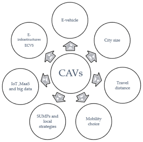 The manuscript therefore lays the foundations for the definition of strategies that can be implemented in the various types of cities of today and the next few years, encouraging the development of specific, operational components that can adapt the development of CAVs to smart cities (e.g., through the dissemination of induction technologies for recharging electric cars and various devices, the dissemination of educational campaigns that allow a drastic reduction in the use of private vehicles and greater attention to shared mobility, and also continuous research related to the ethical and social aspect of the use of CAVs). Several cities, after small-scale experimentation, have already planned and introduced a better development of sensor networks throughout the city, capable of making humans interact with cars and the environment (e.g., smart intersections, smart roads, autonomous parking and electric vehicle charging points).