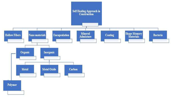 It is a universal fact that when a body of a human being is injured, the skins and tissues get recovered themselves on account of the assimilation of nutrients which creates new-fangled replacements to mend the damaged areas. Analogously, the same kind of self-healing characteristic is possible in the cements-composites when healing agents were incorporated in the mixture at the time of manufacturing the self-healing composites, which act similarly as the nutrients in the human body. These healing agents repair the cracks in the deteriorated concretes on their own. In the recent past, demanding studies were carried out to discover innovative strategies for well-organized self-healing almost without compromising its durability. Figure 1 and Table 1 exemplify approaches of self-healing for construction composites. This means self-healing is the property of a particular material which is competent enough to repair its deteriorations itself by its means to bring it back to the almost original state and those type of building materials are called, “self-healing composites”. The self-healing can be evidenced through many old concrete structures which are standing erect for prolonged periods with merely restricted maintenance. The chief phases of the natural healing capability are hydration of cement pastes and the inflammation; followed by the CaCO3 precipitation, and finally the obstacle of flow pathways on account of the impurities of the water deposition or the concrete movement in some case bits that get separated all through the course of cracking [10]. An extent of damage, temperature, freeze-thaw cycles, the age of the concrete, and the mortar form and many more are the factors influencing the natural pathway of self-healing [87,88,89]. The adhesives preserved either in short fiber or in longer tubes although, more effectual mechanisms were afterwards adopted by others.