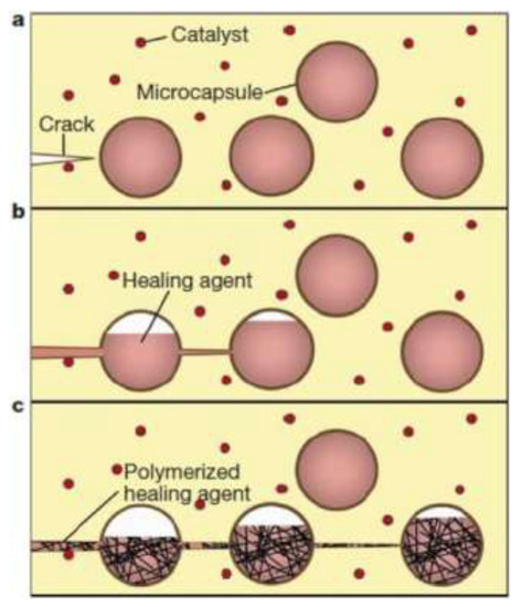 On the one hand, Figure 3 provides an idea for the self-healing [103], whereby the crack breaks the rooted micro-capsules, ensuing the healing agent discharge into crack surfaces using capillary action. Subsequently, the healing agent contacts the fixed catalyst, causing polymerization and therefore the neighboring cracks to plug. The filling of micro-capsules employing healing agent -epoxy resin, whereby the shell of urea–formaldehyde formalin with the size ranging from 20 to 70 μm has been blended by Nishiwaki [105]. The referred micro-capsules and acrylic-resin, which were used as a hardener in the shell form of gelatin with a size varying from 125 to 297 μm were utilized. Nevertheless, the micro-capsules induced with silicate of sodium were efficient for self-healing. During this research work, firstly, concrete was stacked to approximately the breaking point before the load was removed and then healed for 7 days. The upshots unearthed that the concrete having two percent silicate of sodium micro-encapsulation could recover maximum to 26% of its authentic strength in comparison with the reference specimen with merely 10% improvement. The conclusion was made that by escalating the quantity of healing agents, even though upper strength ratio of recovery could be obtained. Du et al. [91] examined the one component micro-capsules which were produced with paraffin as the shell and toluene diisocyanate (TDI) as the healing agent. The findings suggested that the TDI was encapsulated fruitfully in the shell of paraffin, and the mortars incorporating micro-capsules exhibited more encouraging capability of self-healing.