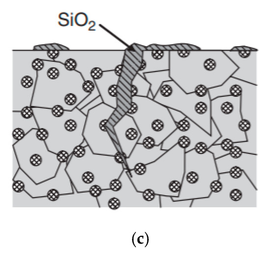 Authenticity and commercial significance are the root cause for most far-reaching usage of concrete as a building material for constructions and infrastructures worldwide [1]. However, its deterioration through cracks development over a time period is one of the key factors resulting in mitigation of the structure’s quality. Development of cracks in between its service life happen in concrete structures irrespective of its type, mix design, etc., on account of exterior and interior factors viz., over-load, shrinkage, exposure to severe environmental conditions, design error, etc. [2,3]. That means, in field applications, factors responsible for cracks formations are either environmental or mechanical types. This challenge, essentially, necessitated to be addressed or else the openings in the form of cracks facilitates chemicals, waters, fluids, detrimental gases like CO2, etc., to penetrate declining its service life which may result in one day in eventual failure of structures for longevity. For this reason, the enhancement of the quality of structures of concrete becomes an issue of intense magnitude on an urgent basis. Nevertheless, the repair and maintenance cost of projects of old concrete construction is not merely fairly heavy but also time-consuming, along with uneasiness to reach the interior of cracks to mend [4]. Consequently, the concepts of developing a new-fangled construction material which can heal the smash up autogenously to make certain the extension of the service life of concrete structures were investigated by researchers in the past couple of years [4,5]. Fortunately, self-healing concrete is competent enough to repair cracks autogenously by means of hydration of cement, carbonation of hydration products when water is present with CO2 and leaking. This nature of concrete to heal cracks on its own is highly sought-after to operate their repairs and maintenance works effortlessly.