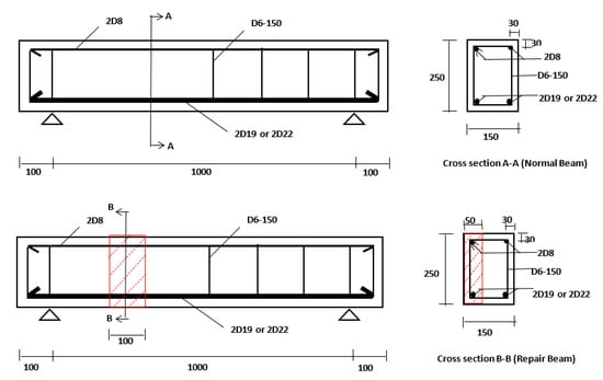 The concrete used for this investigation was a conventional (normal) concrete. Its mixture was proportioned following the Indonesian Standard [] to achieve an average strength of 25 MPa. The obtained mix composition per m3 of concrete was as follows: 388 kg of cement, 771 kg of sand, 941 kg of coarse aggregate, and 225 kg of water. The actual strength of the concrete was determined by the testing of cylinder specimens of 150 × 300 mm. The compressive strength obtained at 28 days was 23.80 MPa and 25.29 MPa for batch 1 and 2, respectively. Meanwhile, the repair material used for patching the reinforced concrete beam was a UPR mortar. It was made from the following constituents per m3: 950 kg of sand, 808 kg of cement, 143 kg of fly ash, 475 kg of UPR, and 24 kg of hardener. The compressive strength of the UPR mortar was determined following the ASTM C 579-01 []. The average compressive strength obtained at 1 day was 73.67 MPa.