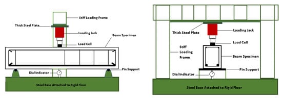 The beams were tested under a concentrated load which was applied at the mid-span (Figure 2). The load was incrementally imposed at 2kN for each step of loading. This rate of loading was maintained until the beams failed. The shear failure mode of the beams was observed from the initiation, propagation, and final development of the crack patterns. Particular attention was paid to the formation of diagonal cracks, since this type of crack is exclusive to the shear failure mode. The span to depth ratio (a/d) of the tested beams was 2.38, and so the investigation was limited to observe only one type of shear failure. According to [], the a/d of 2.38 is thought to be a transitional value between very short and slender shear spans. The shear transfer mechanism in this type of beam comprises the arch action and beam action, which can be investigated through experimental work and numerical analysis.