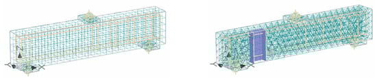 Meshes of solid 3D finite element generated for both normal and repair beam are shown in Figure 4. A linear brick element type was used for generating these meshes. In the real experiment, the beam was laid on top of pin supports. These supports provided a vertical restraint for the downward movement, but no restraint for the upward movement. The horizontal movement was partially restrained. For these reasons, the supports were modelled as nonlinear spring with a massive stiffness to resist the downward movement and a light stiffness to slightly restrain the upward movement. In addition, a linear elastic spring was defined to partially restrain the horizontal movement. Table 2 summarizes properties of materials and their corresponding constitutive models used in this investigation. Numerical simulation was performed by testing the beam models with a force at specified joint, i.e., at the top centre of the beam. The load was incrementally applied at 200 N until failure. The rate of loading was definitely lower, i.e., about one-tenth of the experimental loading. The smaller rate of loading in this simulation was intended to capture more details of the development of the cracks. The numerical simulation was expanded on similar beams but with various reinforcement ratios.