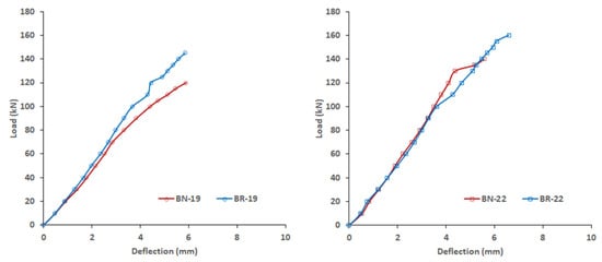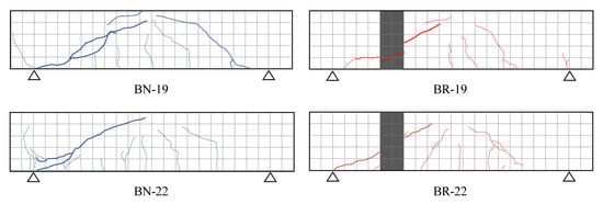 The influence of the UPR mortar on the shear failure mode can be studied from the comparison of the crack development in the normal and repair beams (Figure 7). In both beams, flexural cracks begin at a similar load (about 30 kN). With regard to the diagonal crack formation, the presence of UPR mortar disrupts the continuity of diagonal crack. Even in the BR-22 specimen, diagonal crack does not cross over the UPR-mortar. The lower modulus of elasticity of the UPR mortar compared to the parent concrete could cause the stresses are more concentrated in the concrete section; and so that although the UPR mortar remains solid, on the contrary, the parent concrete section may suffer intense cracks. The observation of crack patterns on the opposite side of the beams confirmed this. The final formation of shear crack that dictates the failure mode of the repair beams occur at higher loads compared to the corresponding failure loads of the normal beams. The UPR mortar can increase the shear strength of reinforced concrete beams around 15–20%.