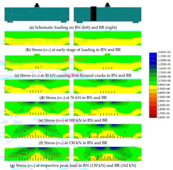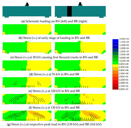 At the early stage of loading, negative and positive normal stresses (σxx) due to flexural moment can be identified above and below the neutral axis, respectively. Similarly, negative and positive shear stresses (τxx) due to the shear force can be observed at the left and right shear span, respectively. At this early stage of loading, no crack is found. Therefore, the normal stresses are distributed proportionately in the compression and tension zones. In the same way, a fairly equal distribution of shear stresses can be seen in the left and right shear span.