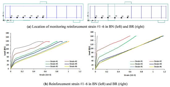 The evolution of longitudinal reinforcement strain (ϵxx) is presented in Figure 10. At the early stages of loading, the tensile strain along the longitudinal reinforcement follows the bending moment, where the maximum value occurs at the mid-span (strain#6). After flexural cracks occur at a load of 30 kN, the tensile strain of the longitudinal reinforcement at the mid-span (strain #6) start to deviate from the original straight line. Further increase of load up to about 50 kN will cause the strains at around the mid-span (strain #3–6) start to increase sharply. At a loading stage corresponding to the first diagonal cracks (i.e., 100 kN for BN and 130 kN for BR), an increase of tensile reinforcement strain can be observed in a wider zone (strain #1–6). This wider zone of tensile reinforcement strain is related to widespread cracking zone at this load level (see Figure 8 and Figure 9). It can be noted that the presence of UPR mortar tends to conserve the development of strains in the tensile reinforcement to the left of UPR mortar. Even the reinforcement strain #1 of BR is hardly increased. On the other hand, reinforcement strains to the right of UPR mortar (strain #4–6) exhibit higher values; it is interesting to note that strains #4–6 develop similar magnitude. This behaviour indicates that more stresses are distributed to the right of the UPR mortar. At the final stage of loading, high tensile strain extends almost along the whole of the longitudinal reinforcement, with the exception of strain #1 in BR. Examining Figure 8, Figure 9 and Figure 10 and especially the evolution of stress and strain distribution from the first diagonal cracks formation to the final stage of loading, one can see that there is a transition of the shear resistance mechanism from beam action into arch action.