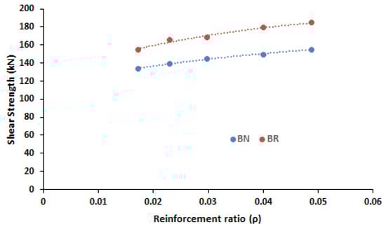 It has been shown that the use of UPR mortar as a patch repair material can alter the initiation, propagation, and final formation of primary diagonal cracks, leading to shear failure of the reinforced concrete beam. The alteration of diagonal cracks development results in an increase of shear strength. The experimental investigation confirms that the shear strength of repair beam is increased by 15–20% compared to the normal beam. In this section, numerical simulation is carried out to show the influence of UPR mortar on shear strength at expanded reinforcement ratio. The results are presented in Figure 11. The increase of shear strength with respect to the use of UPR mortar as a patch repair material can be observed consistently at an extended reinforcement ratio. The level of increase is slightly greater at a higher reinforcement ratio.