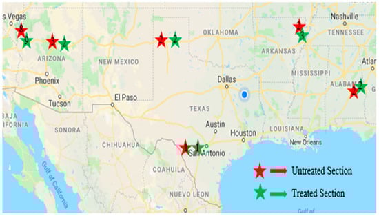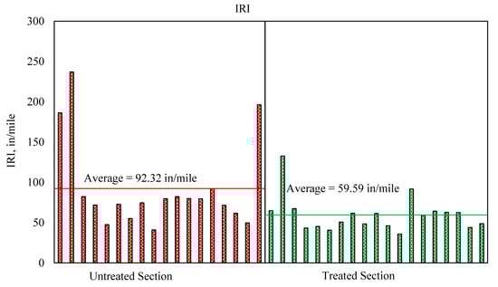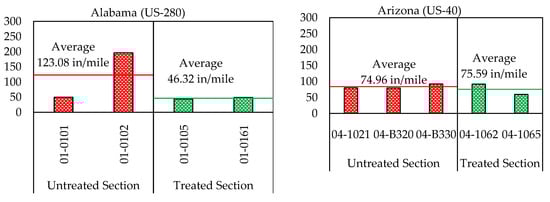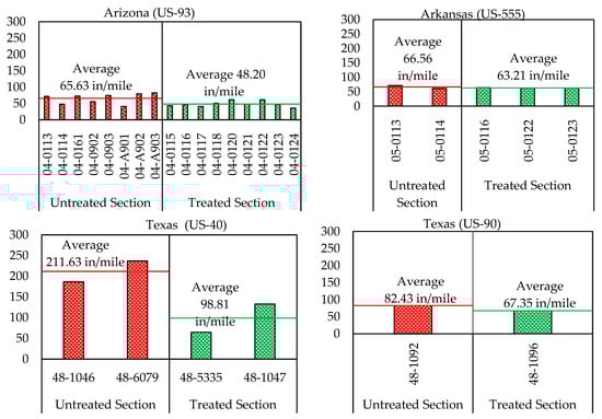 The roughness of the road surface has long been regarded as a significant indicator of its efficiency. Safety, ride comfort, and vehicle wear is all directly influenced by the roughness. It also raises the dynamic loading exerted on the pavement by cars, hastening the degradation of the pavement system []. Mean roughness, measured in terms of the international roughness index (IRI), of the treated and untreated sections in the four selected various States, with both the untreated and treated sections on a similar highway and subjected to the similar traffic level and conditions of climate is shown in Figure 6 (y-axis is IRI in inches/mile).