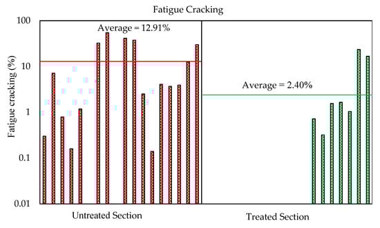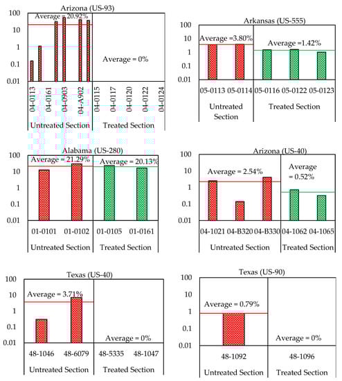A series of interconnected cracks formed due to fatigue failure of the HMA surface (or stabilized base) under frequent traffic loading is known as fatigue cracking. In thin pavements, cracking initiates in the layer where the tensile stress is the highest, i.e., at the bottom of the HMA, and then propagates to the surface as one or more longitudinal cracks []. Figure 2 shows the average fatigue cracking percentage (y-axis) of treated and untreated sections in the considered four different States.