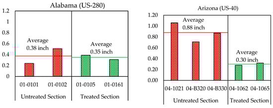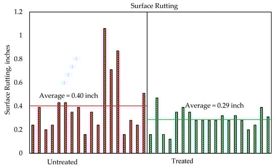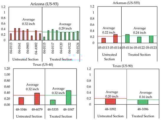 One of the most significant load-associated distresses in the flexible footway process is Rutting. Rutting generally occurs by the accumulation of permanent deformation in all the layers within the footway structure. Rutting appears as longitudinal depressions along the roadway causing roughness, hydroplaning, and other security sections [,]. Figure 4 shows the mean rutting in inches (y-axis) of the treated and the untreated parts in each four states, with both the treated and untreated parts on similar roadways and subjected to the same climatic states and the similar level of traffic.