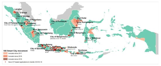 Distribution map of cities and regencies that are included in the 100 Smart City movement in Indonesia. Source: [].
