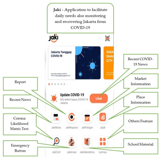 The coronavirus pandemic has resulted in increased anxiety in society. Small and medium-sized enterprises (SMEs) have also been affected by the pandemic in the form of strict quarantine regulations []. The constant flow of information regarding the virus, which is not always based on accurate medical facts, has made people even more anxious. Thus, credible sources of data and information through a variety of channels are urgently needed []. By making use of modern technology, information on coronavirus and its spread can be fast and accurately obtained []. Furthermore, the development of new technologies can offer innovative ways to provide additional income for SMEs []. Artificial intelligence (AI) and big data have enormous potential when managing COVID-19-related information in smart cities []. Therefore, it is necessary to have mobile applications that are both accessible and easy to use. Several cities in Indonesia that have applied the concept of a smart city have provided their residents with mobile applications. The function of these applications is not only to access information but also to support activities such as working, shopping, and studying. In addition, the applications can be used to remotely access public services which are provided by the government to help mitigate the spread of the virus []. People have started to use ICT-based applications to adapt to global changes and challenges regarding their life, work, and socialization [].