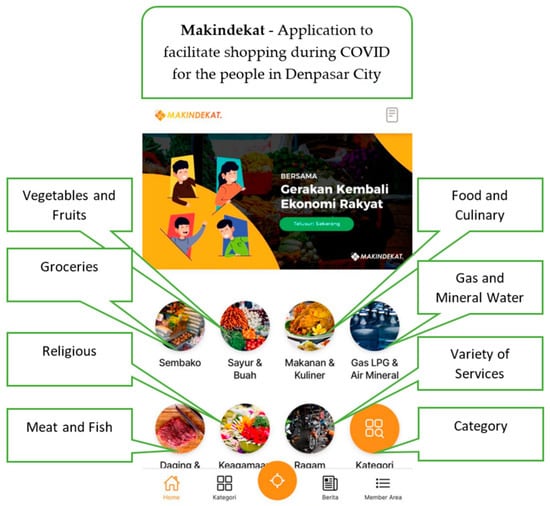 The pandemic has had a profound effect on the economic conditions of many regions. Denpasar, the capital of the province of Bali, is one of the regions most affected by the pandemic. Denpasar, with its international tourism potential, cannot certainly be separated from its economic activities. One of the efforts made by the Board for Creative Economy of the city was to develop an application called “Makindekat” (see Figure 5). The aim of the application was to facilitate shopping needs so that people do not have to leave their homes. The application can be used to do shopping at your nearest grocery store that is no more than five kilometers away. By making effective use of this application, large-scale social distancing becomes possible at the time of pandemics. At the same time, economic turnaround in the region and economic activities in the villages will occur to recover. In this type of business environment, shopping online can have competitive sustainable advantages []. This application is developed by the Board for Creative Economy in cooperation with the City Government of Denpasar. It is also used as a database of merchants in the city.