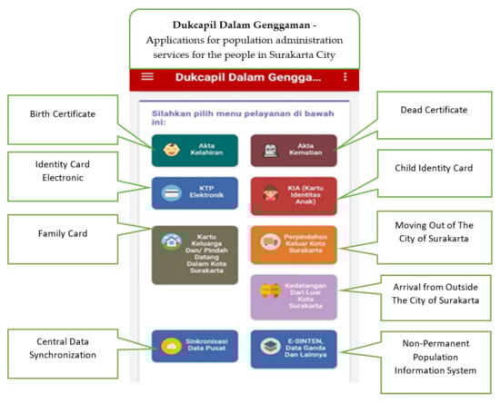 The Office of Population and Civil Registration of Surakarta has launched the “Dukcapil Dalam Genggaman” application (see Figure 7) to facilitate its residents’ administration services []. Residents no longer need to queue and wait long times to get city’s administration services. “Dukcapil Dalam Genggaman” contains services for managing electronic identity cards, family cards, birth certificates, children’s identity cards, and death certificates []. The launch of this Android-based application is a new innovation for the Surakarta City Government to increase public awareness while making it easier to manage its population administration simultaneously []. This application can cut its users’ queuing times by about 30 percent and reduce the potential of brokering [].