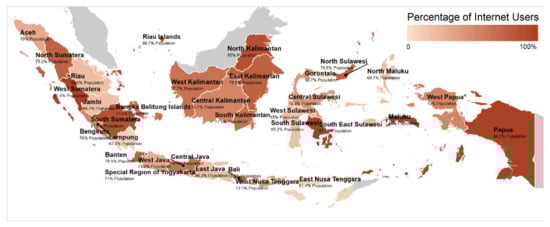 Internet penetration is the relationship between the number of internet users and population demographics in a particular area or region []. It goes without saying that the success of using applications to handle the COVID-19 pandemic as well as smart city implementation also depends on the internet penetration levels in each city or regency. Based on the results of a recent survey from the Indonesian Internet Service Providers’ Association (APJII), Indonesian internet penetration levels stood at 73.7% of the total population in 2020. The highest percentage of internet users as per total population is from the provinces in the islands of Sumatra and Sulawesi, such as West Sumatra (91.4%), Riau Islands Province (86.7%), and Southeast Sulawesi (87.1%) as shown in Figure 8. In the future, affordability regarding the internet needs to be improved as part of increasing ICT infrastructure.
