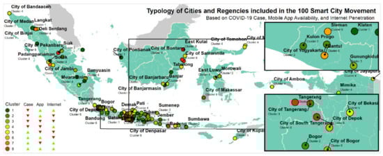 Distribution map of the typology of cities and regencies included in the 100 Smart City movement in Indonesia, based on confirmed COVID-19 cases, mobile app availability, and internet penetration.