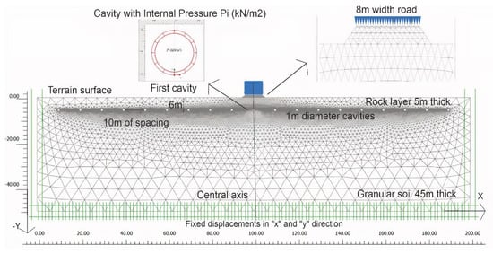 3], where its results indicated that the stratigraphy without cavities supports the highway load; nevertheless, with 9 cavities in the granular soil the stress path changes direction, affecting the terrain surface and presenting a subsidence.