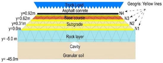 N3, y = 0.62 m), underlining that the base course layer gets more stressed than the subgrade layer due to the truck load. Nevertheless, the first cavity (