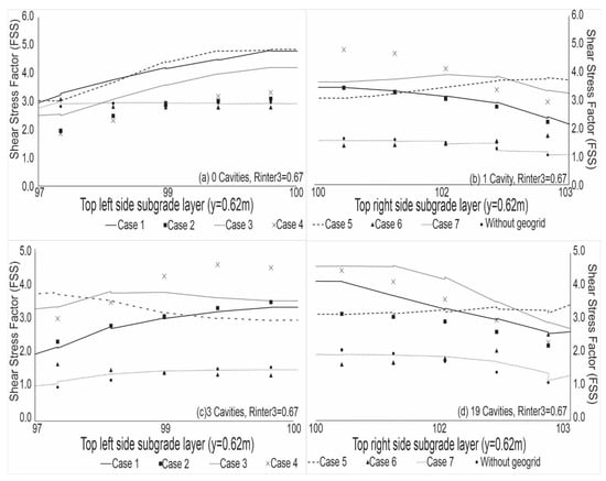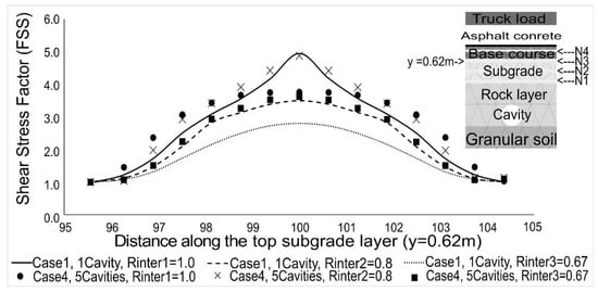 FSS decrease in the top of the subgrade layer compared to the graph with 0 cavities and the Case 4 (cross mark with