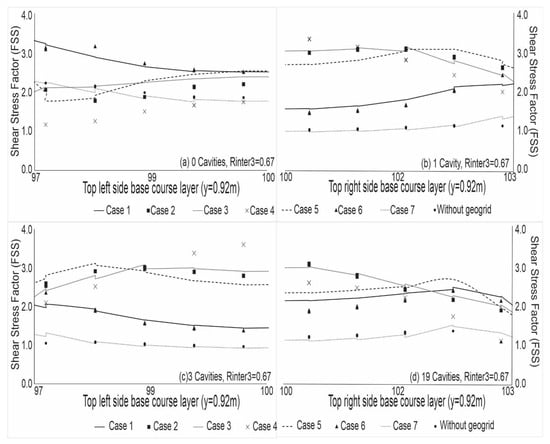 FSS values. For the top of the base course layer (y = 0.92 m), only Case 7 (one geogrid