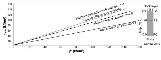 In the surface rock layer (PA, y = 0.0 m), the stresses are increased until the 3 cavities (black triangle mark) in both cases (compression behavior). When subsequent cavities are developed, the stresses return following the same line and due to the relaxation effect of the horizontal stress (σ’3 = σh) with the particularity that in the model with geogrids (N1 and N2 positions—Case 2) it generates stresses with higher values due to the differences in the numerical modeling.