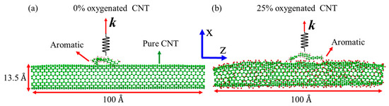 Since their discovery in 1991, many researchers have extensively studied carbon nanotubes (CNTs) for their exceptional properties such as low density, high mechanical properties, and outstanding electronic properties [1]. CNTs can be imagined to be formed by rolling up a graphene sheet (a two-dimensional hexagonal lattice of carbon atoms in one layer) into a cylindrical shell. Each carbon atom in CNTs is connected to three neighboring atoms (≅0.146 nm C–C bond length), forming sp2 hybridized atomic structures. Studies have shown that the properties of CNTs can be tailored with surface functionalization [2] for different applications such as drug delivery and biosensors [3]. Functionalization of CNTs with oxygens (O=CNTs), hydroxyl groups (HO–CNTs), and hydrogens (H–CNTs) have been introduced by many researchers for different applications such as purification, biosensor [4,5,6], hydrogen storage, and semiconductors [7,8,9,10]. The functionalized atoms such as oxygens change the intrinsic properties of CNTs through change in sp2 atomic structure and improve interfacial adhesion and solubility [2]. In recent years, there has been a great interest in employing CNT-, graphene-, graphene oxide (GO)- and polymer grafted graphene as modifiers to improve fatigue life and performance of asphalt binders [11,12,13,14,15]. A study on the intrinsic healing capacity of GO-modified asphalt binder showed that increasing the dosage of GO improves thermodynamic properties and self-healing capacity of aged binder [15]. While exceptional properties of CNTs can improve the performance of CNT-modified asphalt binders, weak interfacial properties and load transfer at the interface can dramatically decrease their properties [16,17]. Functionalized CNTs, however, can enhance interfacial properties and bring CNTs closer to their full potential. Most studies on the functionalized surface of CNT can be related to the usage of graphene oxide (GO) [15,18], which has similar chemistry in asphalt binder. However, there have been few studies on the usage of functionalized CNT (with 3% carboxylic acid groups) in asphalt binder [19]. Previous studies have shown that the contact and diffusion of molecules at the interface are important factors behind the molecular adhesion of materials [20,21,22,23,24]. Therefore, the aggregation and distribution of saturate, asphaltene, resin, and aromatic (SARA) molecules on the surface of inclusions (CNTs, aggregates, etc.) are crucial in defining the adhesion behaviors of the asphalt–inclusion interface. For example, Huang et al. studied the diffusion of SARA molecules on mineral surfaces. They showed that the adhesion between asphalt and aggregate could be improved via the diffusion of SARA molecules on the aggregate surface [20]. A study by Luo et al. on the diffusion of SARA molecules on the mineral aggregate demonstrated that the diffusion of SARA molecules on the Al2O3 aggregate could be independent of temperature due to the interaction between asphalt components [25]. In recent years, many researchers have employed molecular dynamic (MD) to study the properties of the binder at the nanoscale [17,26], diffusion of SARA molecules on various aggregates [20,23,24,25,27,28,29], interactions of Graphene-SARA [30], the interactions of SARA-CNTs and CNTs-aggregate [16,31].