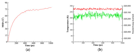 Figure 3. The change of (a) mean square displacement (MSD) and (b) temperature and potential energy during 1000 ps is shown.