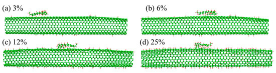 Figure 5. Molecular structure of aromatic molecule and CNTs with different oxygenated dosage of (a) 3%, (b) 6%, (c) 12%, and (d) 25%.