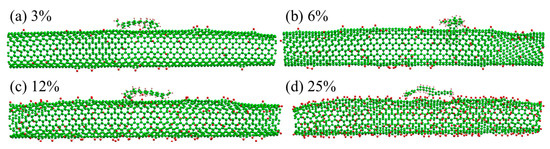 The generated dosage of 3–25% hydrogenated and oxygenated CNTs are shown in Figure 4a–d and Figure 5b–d, respectively. Our simulation shows that above 25% dosage of randomly positioned hydrogens and oxygens, CNTs becomes unstable, CNTs do not remain as a tube anymore, and several C-C bonds break. Therefore our results are limited to a maximum 25% dosage. We use similar oxygenated and hydrogenated CNTs structures for each SARA molecule to avoid random oxygenated and hydrogenated effects on the results. As mentioned in Section 3, after constructing the hydrogenated and oxygenated CNTs, each SARA molecule is placed on the CNT surface, and a 1000 ps MD simulation is performed. The final structure after 1000 ps MD simulations of an aromatic molecule on 3–25% hydrogenated and oxygenated CNTs are shown in Figure 4a–d and Figure 5b–d, respectively.