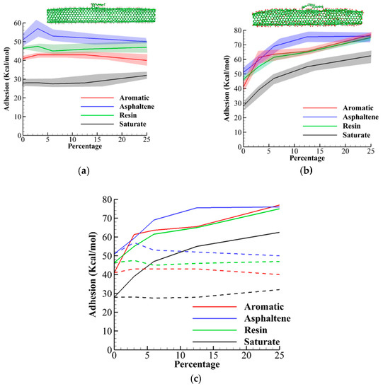 Figure 6 compares the adhesion of SARA molecules for different dosages of hydrogenated and oxygenated CNTs. The adhesion results for hydrogenated CNTs do not show significant variation with changing hydrogen dosage on CNTs (Figure 6a). Among SARA molecules, the asphaltene molecule has the highest adhesion with 55 ± 5 kcal/mol, resin molecule with 45 ± 5 kcal/mol, and then aromatic molecule with 40 ± 3 kcal/mol, and finally the saturate molecule has the lowest adhesion with 30 ± 5 kcal/mol as shown in Figure 6a. For oxygenated CNTs, the result demonstrates that the adhesion of SARA molecules increases significantly by increasing the oxygenation dosage, as shown in Figure 6b. For the asphaltene molecule, the blue region in Figure 6b, adhesion increases from 50 ± 5 kcal/mol for 0% dosage to 75 ± 5 kcal/mol at 12% oxygenation and remain constant at 75 ± 5 kcal/mol for higher dosage (25%). Adhesion of the resin molecule on the surface of an oxygenated CNTs is improved by 50% for 25% dosage as the values change from 45 ± 2 kcal/mol at 0% dosage to 70 ± 2 kcal/mol at 25% dosage (shown with the green region in Figure 6b). Aromatic molecule adhesion values, shown with the red region in Figure 6b, show a similar trend observed in resin molecule and is increased from 40 ± 2 kcal/mol at 0% dosage to 75 ± 2 kcal/mol at 25% dosage (45% increase). However, the best enhancement is observed in saturate molecule, shown with the black region in Figure 6b, with a 100% increase in adhesion at 25% dosage (60 ± 4 kcal/mol). To demonstrate more clearly how hydrogenated and oxygenated change the adhesion properties for SARA molecules, both results have been shown together in Figure 6c with a dashed line representing hydrogenated CNTs and a solid line representing oxygenated CNTs.