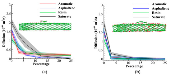 The diffusion of SARA molecules on the surface of CNTs with different dosages of hydrogenation and oxygenation is shown in Figure 7. The diffusion of SARA on hydrogenated CNTs shows a sudden drop in diffusion coefficient by increasing hydrogenation dosage (Figure 7a). The diffusion coefficient of saturate molecule reduces from 2 ± 0.2 × 10−10 m2/s at 0% hydrogen dosage to 0.05 ± 0.05 × 10−10 m2/s at 25% dosage. As expected, the values for diffusion coefficient for saturate molecule is higher than the other components as smaller interatomic forces (adhesion) lead to more movement of molecules on the surface of CNTs. For asphaltene molecules, although the diffusion coefficient is higher at 0% (1.6 ± 0.1 × 10−10 m2/s) than resin and aromatic molecules, the values drop more rapidly. After 6% dosage, they are below those in resin and aromatic molecules. After saturate, and asphaltene molecules, aromatic molecule (red region in Figure 7a) has the highest initial diffusion coefficient at 0% (1.4 ± 0.1 × 10−10 m2/s), but after a sudden drop to 0.4 ± 0.1 × 10−10 m2/s at 3% dosage, the values are smoothly reduced to 0.25 ± 0.1 × 10−10 m2/s at 25% dosage. Finally, although resin molecule has the lowest initial diffusion coefficient at 0% dosage (1.1 ± 0.1 × 10−10 m2/s), it has the smoothest drop in diffusion coefficient, and they values merge to 0.25 ± 0.1 × 10−10 m2/s at 25% dosage (green region). The diffusion of SARA on oxygenated CNTs is shown in Figure 7b. The results show a more sudden drop in diffusion coefficient than observed in hydrogenated CNTs. This alteration is due to higher interatomic forces between SARA and oxygenated CNTs. The diffusion coefficient of saturate molecule reduces from 2 ± 0.2 × 10−10 m2/s at 0% hydrogen dosage to 0.4 ± 0.1 × 10−10 m2/s at 3% dosage and then smoothly reduces to 0.001 ± 0.001 × 10−10 m2/s at 25% dosage. The diffusion coefficient values for asphaltene, resin, and aromatic molecules on oxygenated CNTs with 3% dosage and higher is almost 0.0, and the molecules are stuck on the surface. To demonstrate more clearly how hydrogenated and oxygenated change the diffusion properties for SARA molecules, both sets of results have been shown together in Figure 7c, with a dashed line representing hydrogenated CNTs and the solid line representing oxygenated CNTs. It can be seen that the functionalization with oxygen significantly reduces the diffusion of SARA molecules on the surface. At the same time, a higher dosage of hydrogenation is required for the same diffusion coefficient (Figure 7c). Previous studies show that the diffusion coefficient of SARA molecules and asphalt binder on the aggregates are in the range of 0.8–12 × 10−10 m2/s [12,29,30], which is in the same order as our results for a lower dosage of functionalization. Similar to previous studies, we observed that saturate molecule has the highest diffusion coefficient among SARA molecules [30,31]. The obtained adhesion values range from previously reported values for the pure CNT-SARA interface [10].