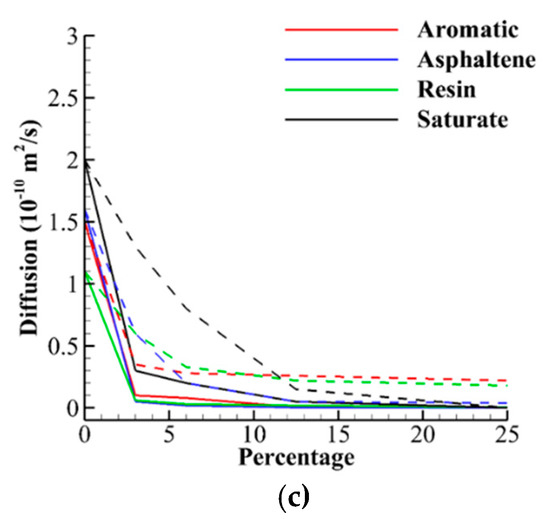 Figure 7. Diffusion of SARA and different dosages of hydrogenated and oxygenated CNTs. (a) SARA-hydrogenated CNTs, (b) SARA-oxygenated CNTs, and (c) comparison of SARA-hydrogenated (dashed lines) and SARA-oxygenated CNTs (solid lines).